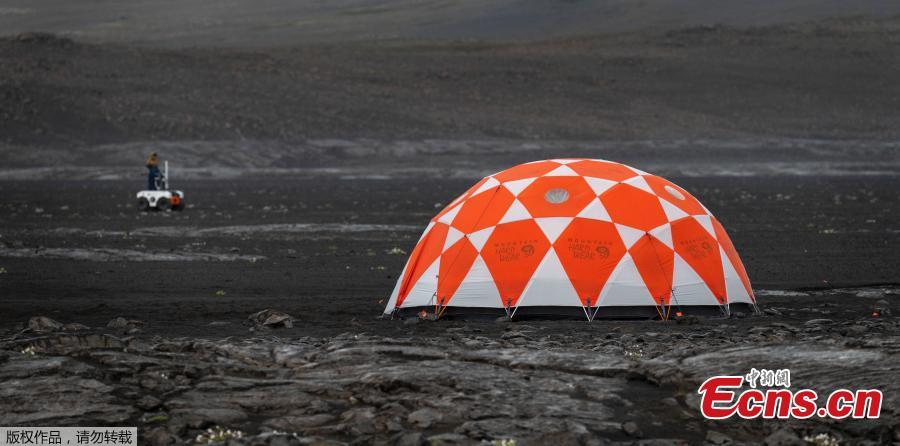 The picture taken on July 19, 2019 shows the NASA base at the Lambahraun lava field in Iceland where they are getting their new robotic space explorer ready for the next mission to Mars. To prepare for the next mission to Mars in 2020, NASA has taken to the lava fields of Iceland to get its new robotic space explorer ready for the job. With its black basalt sand, wind-swept dunes and craggy peaks, the Lambahraun lava field at the foot of Iceland's second biggest glacier, Langjokull, was chosen as a stand-in for the Red Planet's surface. (Photo/Agencies)