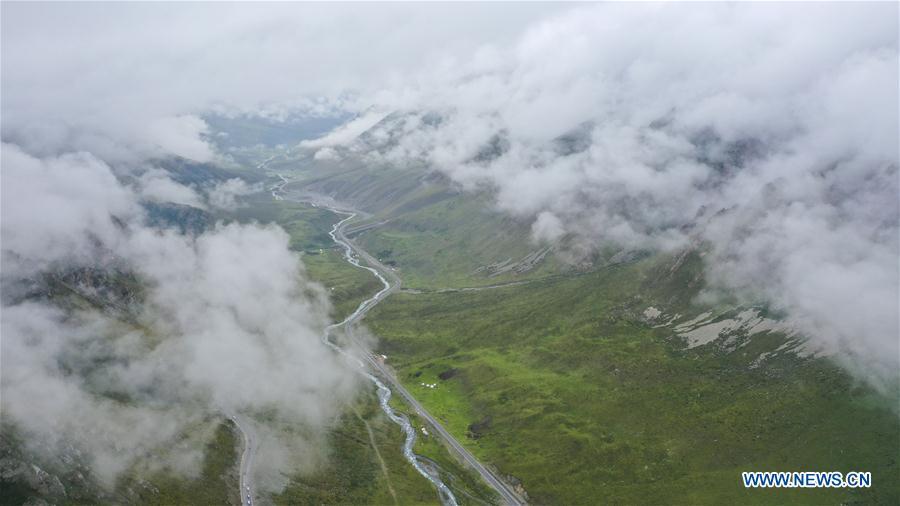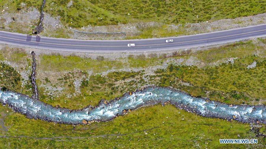 Photo taken on Aug. 17, 2019 shows a pasture by the Dushanzi-Kuqa highway, northwest China's Xinjiang Uygur Autonomous Region. The Dushanzi-Kuqa section of National Highway 217 runs through various of natural landscapes including glaciers, lakes, forests and grasslands, which make it a popular travelling route among self-driving travelers, cycling enthusiasts and hikers. (Xinhua/Li Peng)