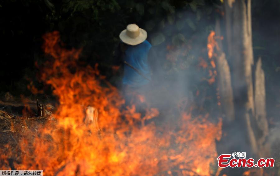 A man works in a burning tract of Amazon jungle as it is being cleared by loggers and farmers in Iranduba, Amazonas state, Brazil August 20, 2019. (Photo/Agencies)
