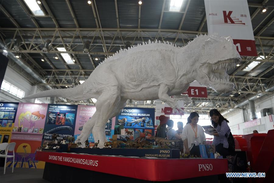 Photo taken on Aug. 21, 2019 shows a dinosaur model during the 26th Beijing International Book Fair in Beijing, capital of China. The book fair along with the 9th China Digital Publishing Expo kicked off at the new venue of China International Exhibition Center on Wednesday. (Xinhua/Jin Liangkuai)