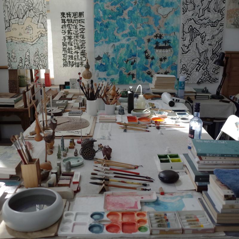 Zeng's studio in Beijing's Songzhuang Art Zone is adorned with paintings and the paraphernalia of a literati. (Photo provided to China Daily)