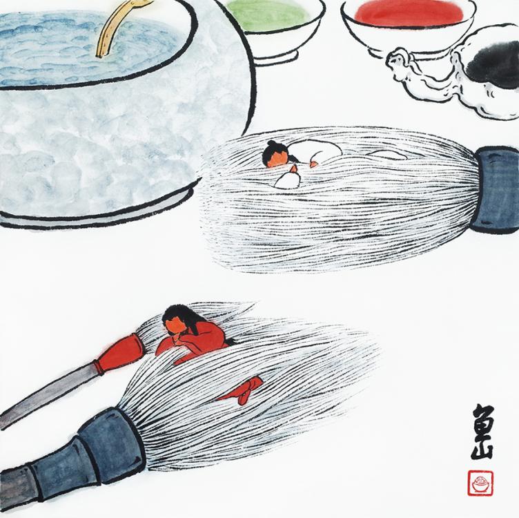 For five years, Zeng Renzhen has been creating a series of paintings centered around this diminutive character who likes to go on adventures, meet new people, take care of chores, and generally enjoy an enviably carefree life.