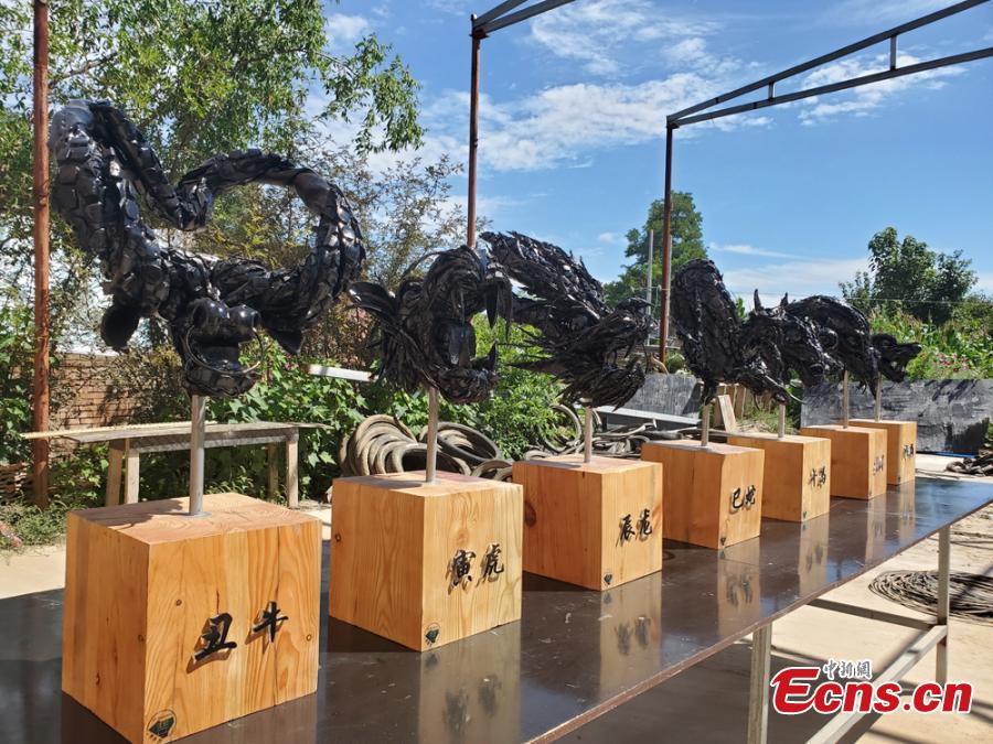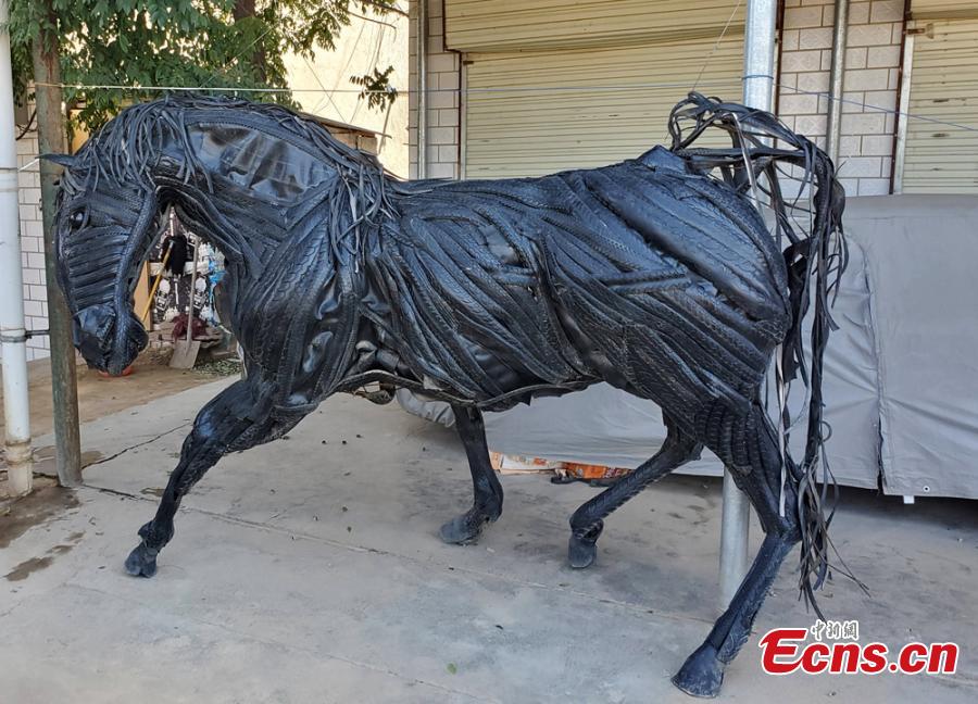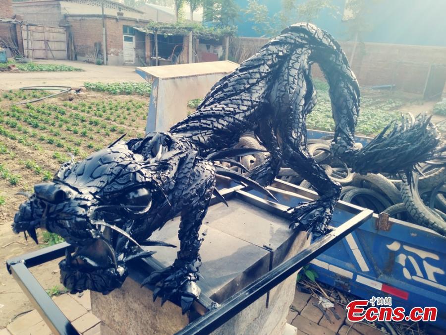 Sculptures made using abandoned tires, created by Zhou Zhenfeng, a researcher specializing in Buddhism at the Hebei Academy of Fine Arts. . A native of Qingyang City in Gansu Province, the 26 year old said he hopes his creation can improve people’s awareness of the need for environmental protection. (Photo: China News Service/Gao Yuting)