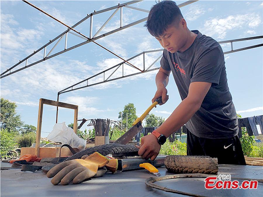 Zhou Zhenfeng, a researcher specializing in Buddhism at the Hebei Academy of Fine Arts, creates a sculpture using abandoned tires and welded steel bars as a frame. A native of Qingyang City in Gansu Province, the 26 year old said he hopes his creation can improve people’s awareness of the need for environmental protection. (Photo: China News Service/Gao Yuting)