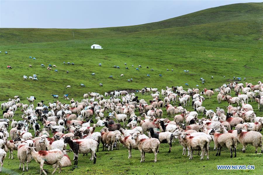 Photo taken on July 27, 2019 shows a flock of goats in a pasture at the foot of Qilian Mountains in northwest China. Located in the convergence zone of the Loess Plateau, the Mongolian Plateau and the Qinghai-Tibet Plateau, Gansu Province in northwest China strides across various landforms including grasslands, forests, deserts, wetlands and mountains. In recent years, through persistent efforts on protecting water conservation area, containing desertification and resuming forests from farmlands, the ecological environment of Gansu has witnessed continuous improvement. Qilian Mountains, an important protection barrier of ecological system in western China, has nourished vast lands in the Hexi Corridor with rich snowmelt, which enables farmlands there to become a major production area of commodity grain and industrial crops. Gannan Tibetan Autonomous Prefecture in southern Gansu acts as an ecological function area for water supplement of the Yellow River and biodiversity of Qinling-Bashan mountainous regions. More than 7.3 million mu (about 486,667 hectares) of wetland in Gannan supplies over ten billion of cubic meters of water to the Yellow River. Featuring various landscapes and colorful cultures, Gansu Province has become a great attraction among tourists at home and abroad. From Aug. 25 to 27, the "Gansu Day" event is held at the ongoing Beijing International Horticultural Exhibition, in which a diversified Gansu is exhibited. (Xinhua/Wu Gang)