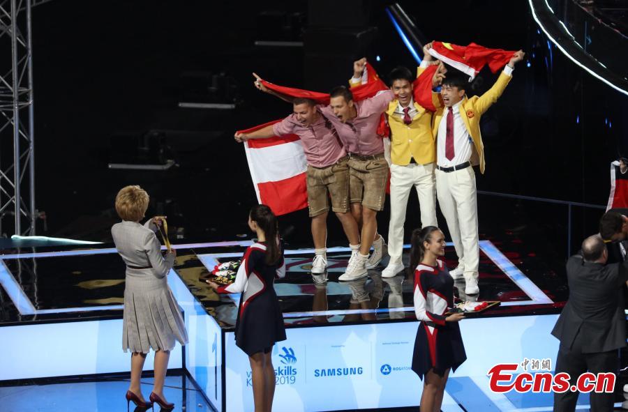 China took the top spot at the 45th WorldSkills Competition held in Kazan, Russia, on Tuesday. China finished the competition with 16 gold medals, 14 silver and 5 medals in total, putting China at the top of the medal rankings, according to the final tally announced at the closing ceremony on Tuesday night. Launched on Aug 22, the week-long event saw over 1,300 competitors from 63 countries and regions. China participated in the competition for the fifth time since becoming a member country of WorldSkills International in 2010. (Photo: China News Service/Wang Xiujun)