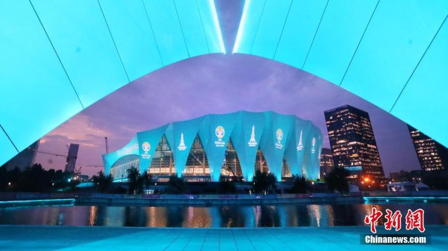 The Shanghai Oriental Sports Center illuminated in red and blue on the night of Aug. 27, 2019 to celebrate the upcoming FIBA Basketball World Cup 2019, which will be held from Aug. 31 to Sept. 15. The FIBA Basketball World Cup 2019 in China will be the biggest edition of FIBA's flagship event with a record 32 participating teams. The tournament will be played across eight cities - Beijing, Foshan, Wuhan, Shenzhen, Dongguan, Nanjing, Shanghai and Guangzhou. (Photo: China News Service/Zhang Hengwei)