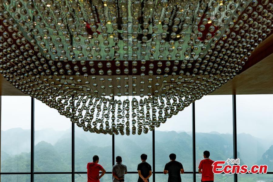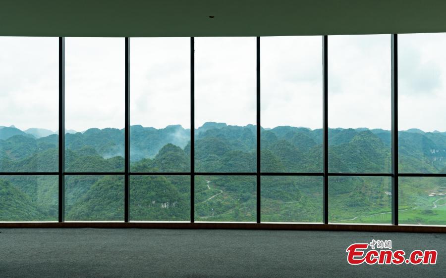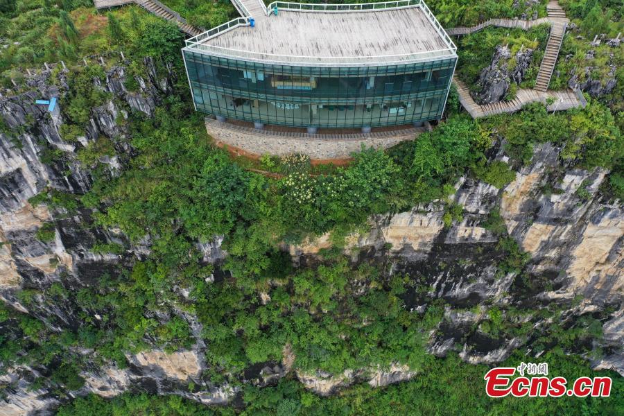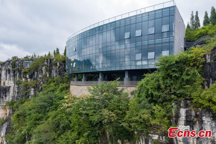 The Limestone Gallery built in the groove of a cliff, 165 meters above the ground, in Anlong County, Southwest China’s Guizhou Province, Aug. 27, 2019. The gallery has a floor area of 800 square meters and can be used as an exhibition hall and a conference venue. It offers a great view of the surrounding rolling mountains. (Photo: China News Service/He Junyi)