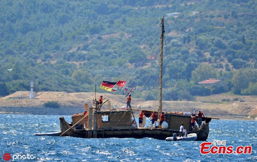 "Abora-IV", which has been made with shipping techniques of ancient period and designed by German archaeologist Dominique Gorlitz arrives in Turkey’s northwestern Canakkale province on August 27, 2019. An international team of archaeologists and explorers is preparing to set sail on a reed boat, hoping to prove that Greek аrgonauts were not the first to trade on the Black Sea. Its unique design is inspired by old Egyptian paintings and constructed using only totora reed and wood. The purpose of the expedition is to sail the routes that connected the Mediterranean with the Black Sea in ancient times, the time of the Chalcolithic necropolis of Varna. (Photo/IC)