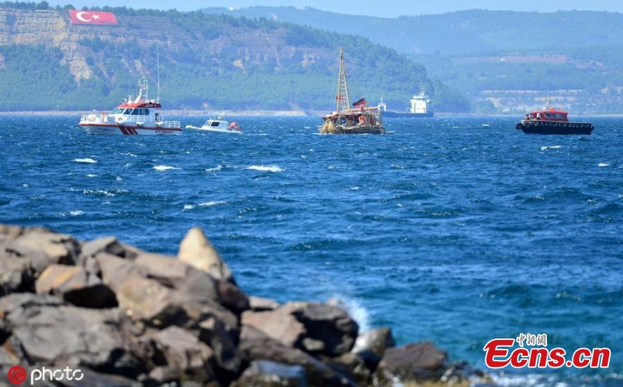 "Abora-IV", which has been made with shipping techniques of ancient period and designed by German archaeologist Dominique Gorlitz arrives in Turkey’s northwestern Canakkale province on August 27, 2019. (Photo/IC)