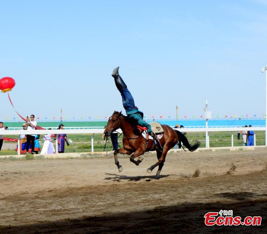 A horse rider shows a stunt during an equestrian performance in Subei Mongol Autonomous County, Northwest China’s Gansu Province. The riders from a local club made all kinds of moves on the running horses, such as standing on two horses in racing ahead. (Photo: China News Service/Yang Fan)