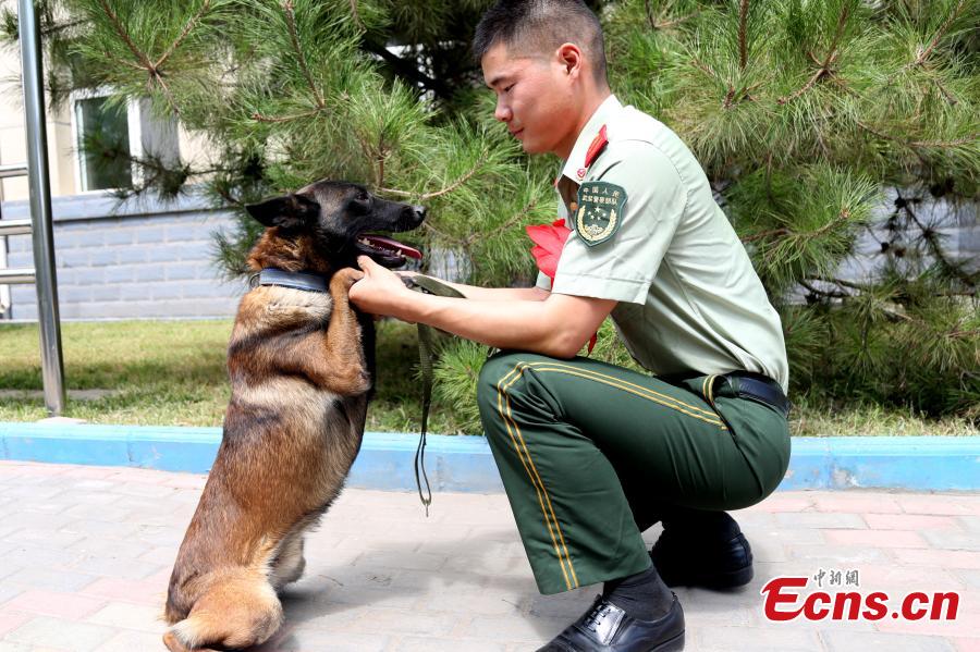 An armed policeman says goodbye to a police dog during a ceremony held to mark the retirement of armed police in Shizuishan, Northwest China's Ningxia Hui Autonomous Region, August 28, 2019. (Photo: China News Service/Luo Huibo)