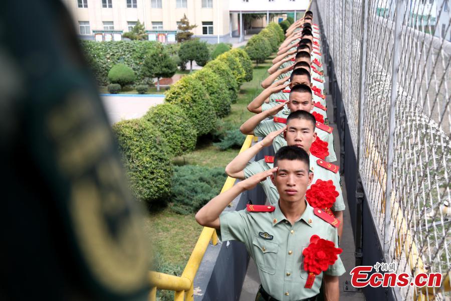 Armed police solute during a ceremony held to mark their retirement in Shizuishan, Northwest China's Ningxia Hui Autonomous Region, August 28, 2019. (Photo: China News Service/Luo Huibo)