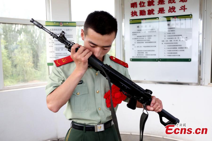 An armed policeman kisses goodbye to a gun during the retirement ceremony in Shizuishan, Northwest China's Ningxia Hui Autonomous Region, August 28, 2019. (Photo: China News Service/Luo Huibo)