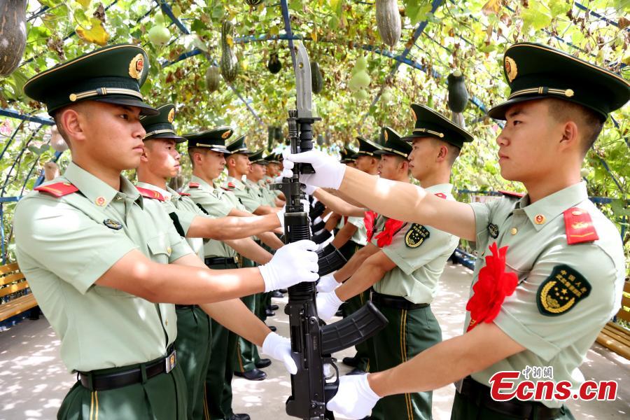 Soon-to-retire armed police hand over guns to new recruits during a ceremony in Shizuishan, Northwest China's Ningxia Hui Autonomous Region, August 28, 2019. (Photo: China News Service/Luo Huibo)