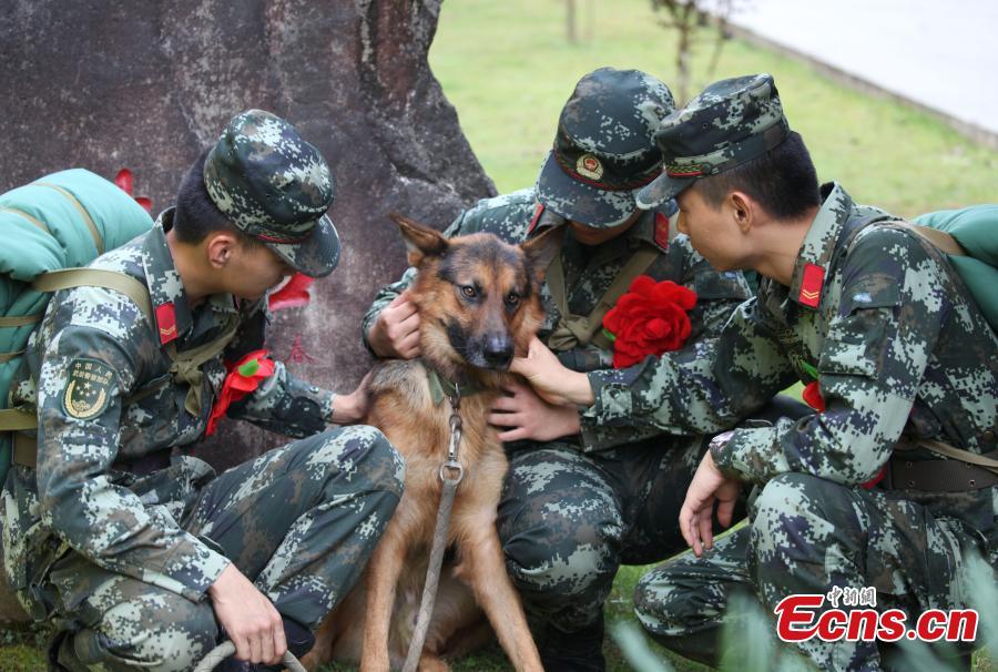 Armed police share a moment with a police dog during a ceremony to mark their retirement in Sanming City, Fujian Province, Aug. 29, 2019. (Photo: China News Service/Hu Xin)