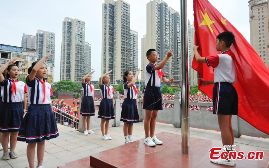 Pupils hold a flag-raising ceremony at Yushui No. 6 primary school in Jiangxi Province, Sept. 1, 2019. New semester began in China. (Photo/China News Service)