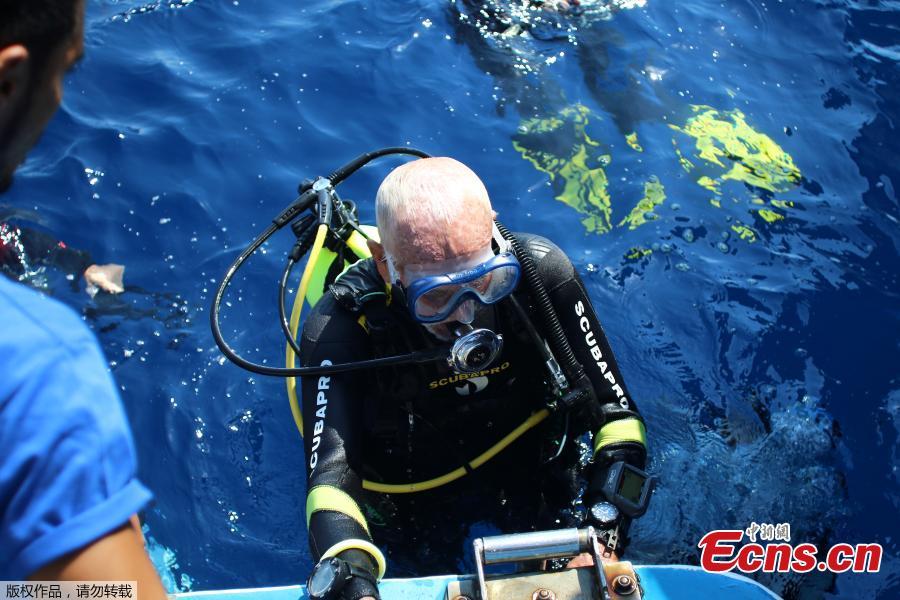 Ray Woolley, diver and World War Two veteran, emerges from the water after breaking a new diving record as he turns 96 by taking the plunge to explore the Zenobia, a cargo ship wreck off the Cypriot town of Larnaca, Cyprus, Aug. 31, 2019. Ray Woolley, who turned 96 on Aug. 28, plunged to a depth of 42.4m for 48 minutes, the event organisers said. He beat his previous record of 40.6m for 44 minutes. (Photo/Agencies)