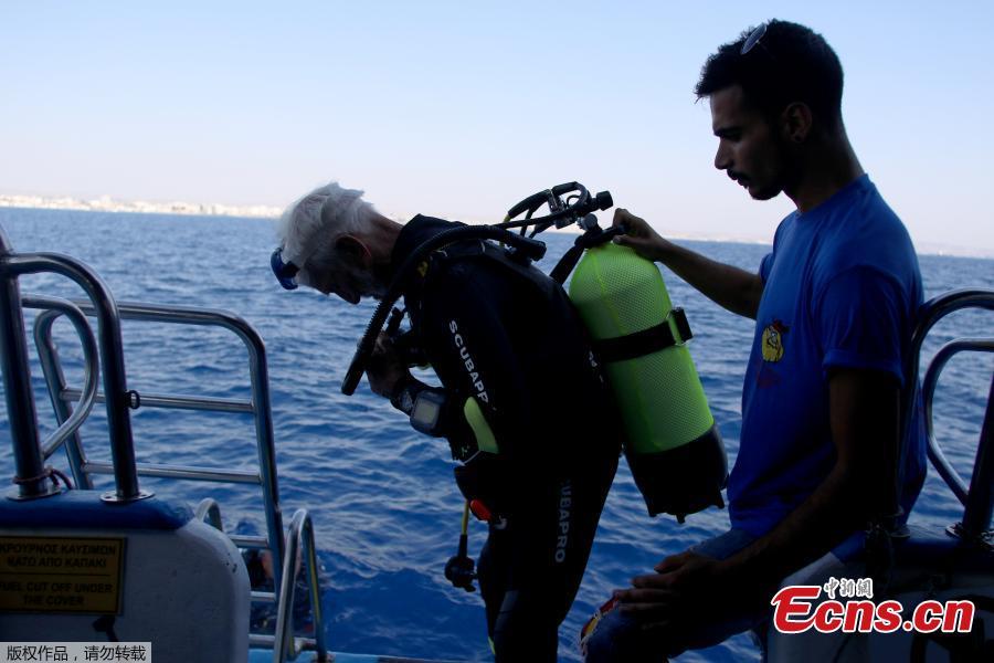 Ray Woolley, diver and World War Two veteran, is seen before breaking a new diving record as he turns 96 by taking the plunge at the Zenobia, a cargo ship wreck off the Cypriot town of Larnaca, Cyprus, Aug. 31, 2019. Ray Woolley, who turned 96 on Aug. 28, plunged to a depth of 42.4m for 48 minutes, the event organisers said. He beat his previous record of 40.6m for 44 minutes. (Photo/Agencies)