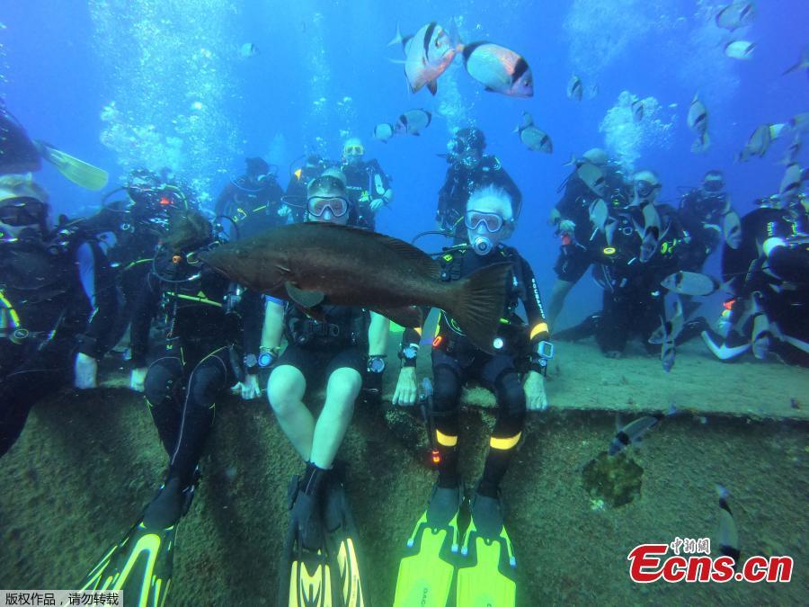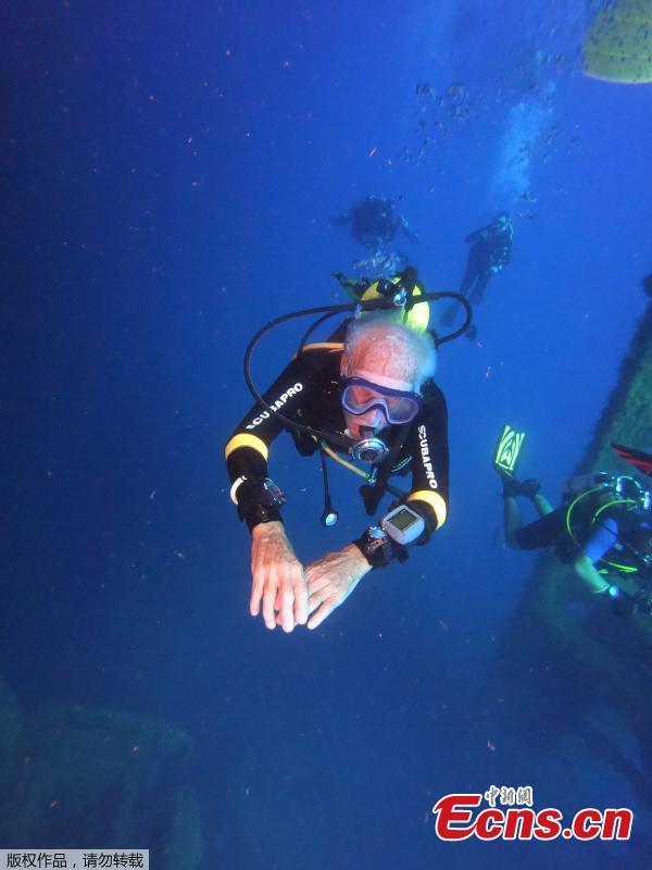 Ray Woolley, diver and World War Two veteran, is seen underwater during a plunge to the Zenobia, a cargo ship wreck off Larnaca, Cyprus, Aug. 31, 2019. Ray Woolley, who turned 96 on Aug. 28, plunged to a depth of 42.4m for 48 minutes, the event organisers said. He beat his previous record of 40.6m for 44 minutes. (Photo/Agencies)