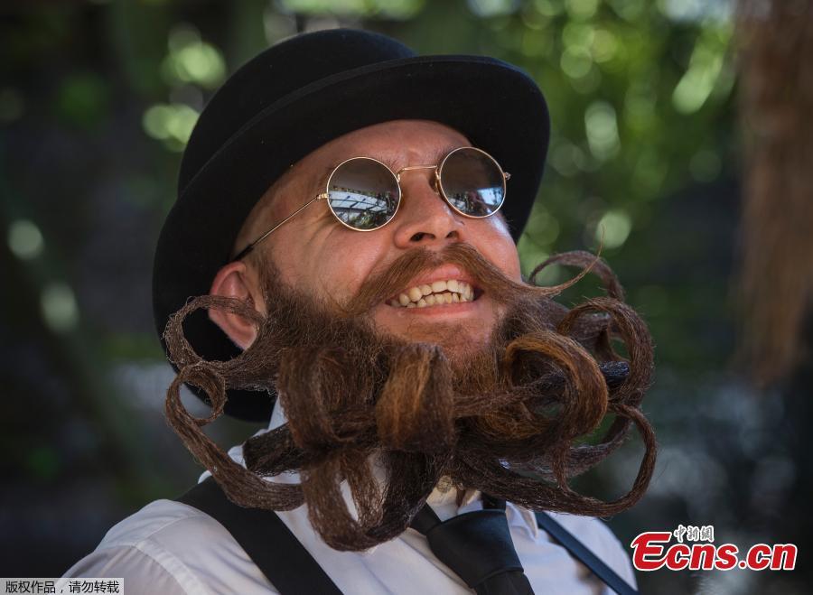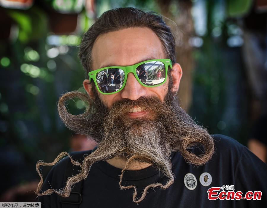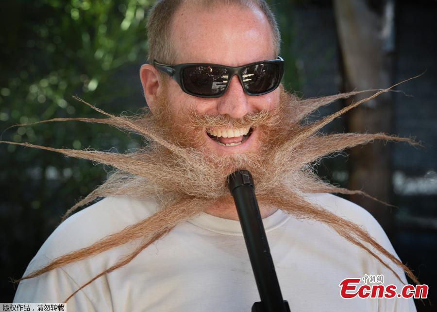 Greg Schoenwolf prepares to compete in the annual "Beard and Mustache Battle", to raise money for charity at the Resident Bar in Los Angeles, California, Aug. 31, 2019. More than 100 competitors competed in 10 different categories for beards and mustaches. (Photo/Agencies)
