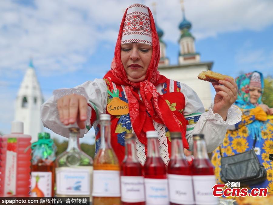 A participant a traditional Russian costume at the annual onion festival in Ivanovo, Russia, Sept. 1, 2019 (Photo/Sipaphoto)