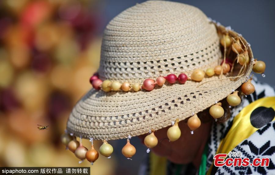 A woman in a hat decorated with onions during the annual onion festival in Ivanovo, Russia, Sept. 1, 2019 (Photo/Sipaphoto)