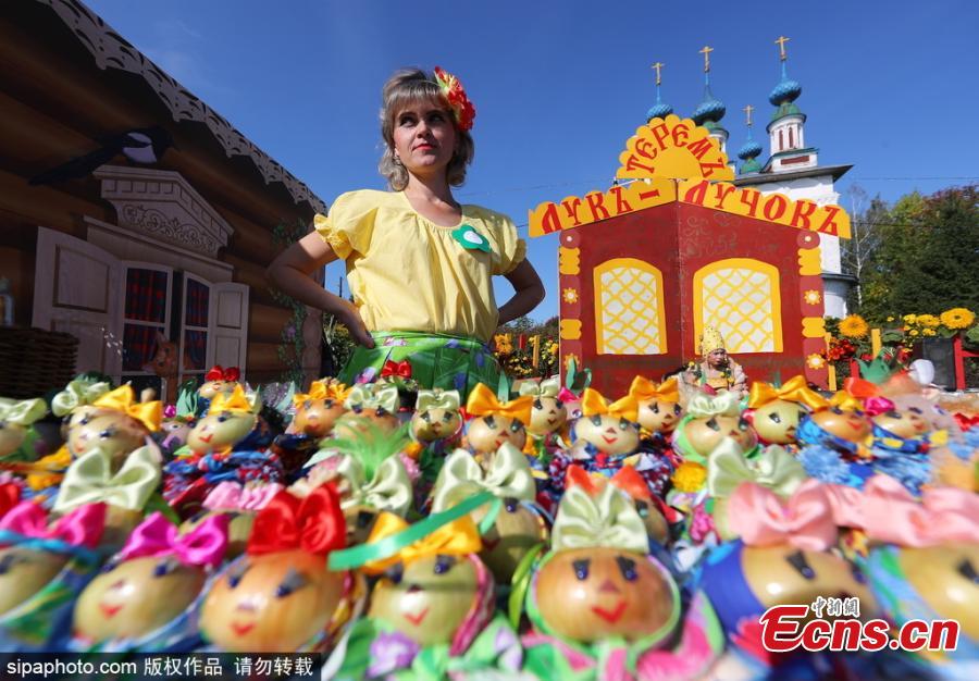 Decorated onion bulbs at a stand of a participant in the annual onion festival in Ivanovo, Russia, Sept. 1, 2019 (Photo/Sipaphoto)