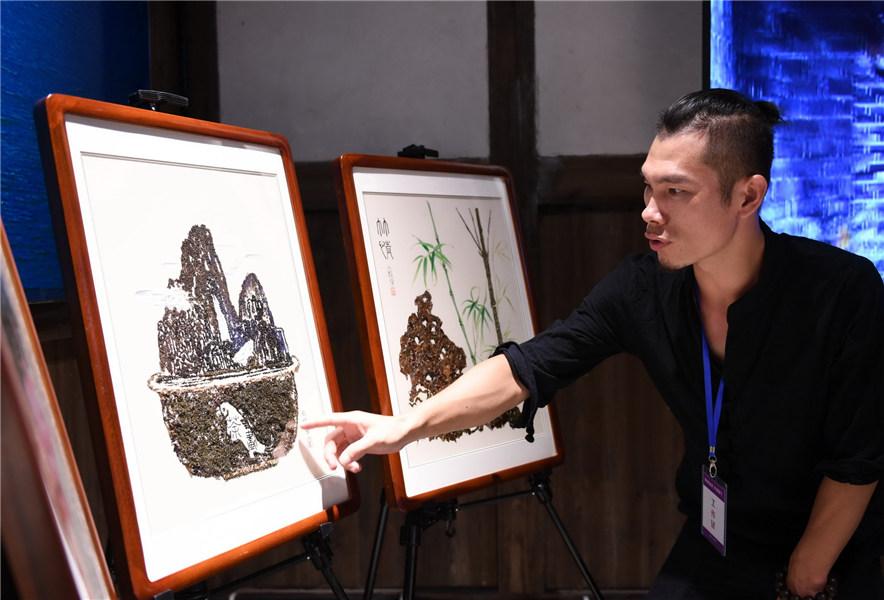Gong Fuying, a painter from East China's Fujian Province, has found an inspiring way to turn 'waste' into wealth. Using tea leaves and stalks, he makes landscape paintings that reflect his hometown. "Sometimes I even use brewed tea leaves, dry them and dye the leaves with different colors," Gong said.