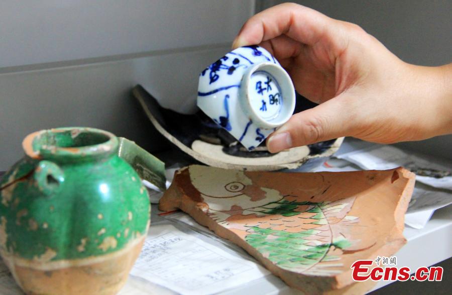 A relic found during an archaeological excavation at the ruins of a distillery that dates back to the Ming (1368-1644) and Qing (1644-1911) dynasties in Suixi County, Huaibei City, Anhui Province, Sep. 3, 2019. The largest remains of an ancient distillery to be found in China, the site was discovered last September during the renovation of a shantytown. Excavation work started in March and has uncovered a number of facilities used in the process of distilling as well as more than 600 relics including vases and bottles. (Photo: China News Service/Zhou Fangling)