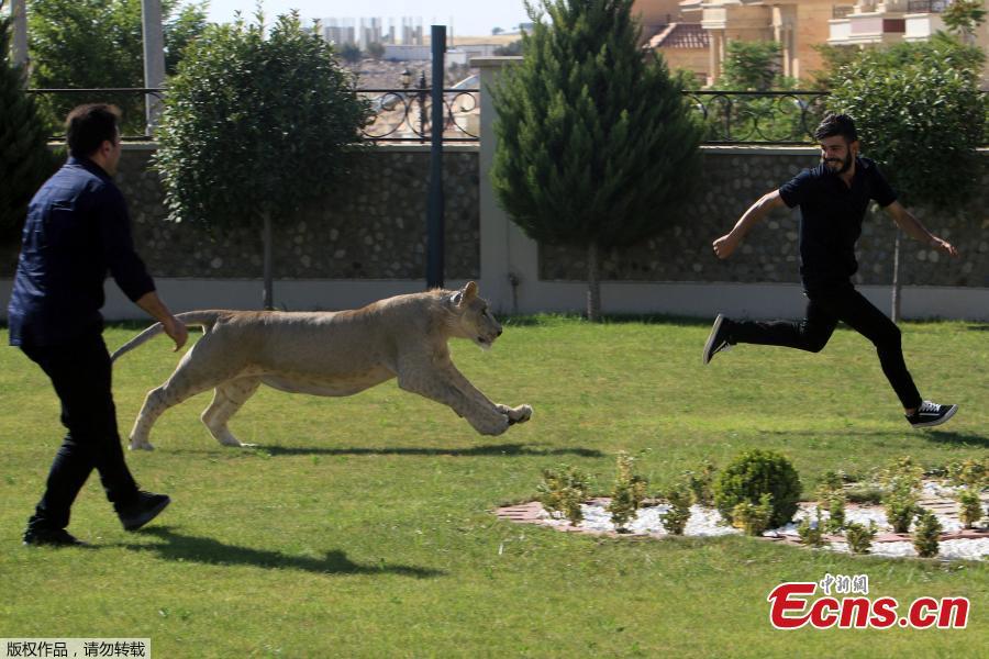 Kurdish Sheikh Blend Mamoon (L) and his aide play with Leo, a 15-month old lion, at his house garden in Duhok, Iraq August 23, 2019. (Photo/Agencies)