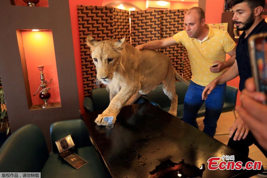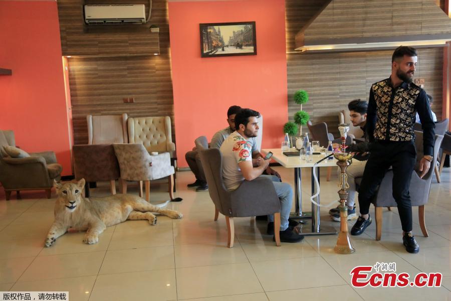 Leo, a 15-month old lion owned by Kurdish Sheikh Blend Mamoon, sits next to people at a cafe in Duhok, Iraq August 23, 2019. (Photo/Agencies)