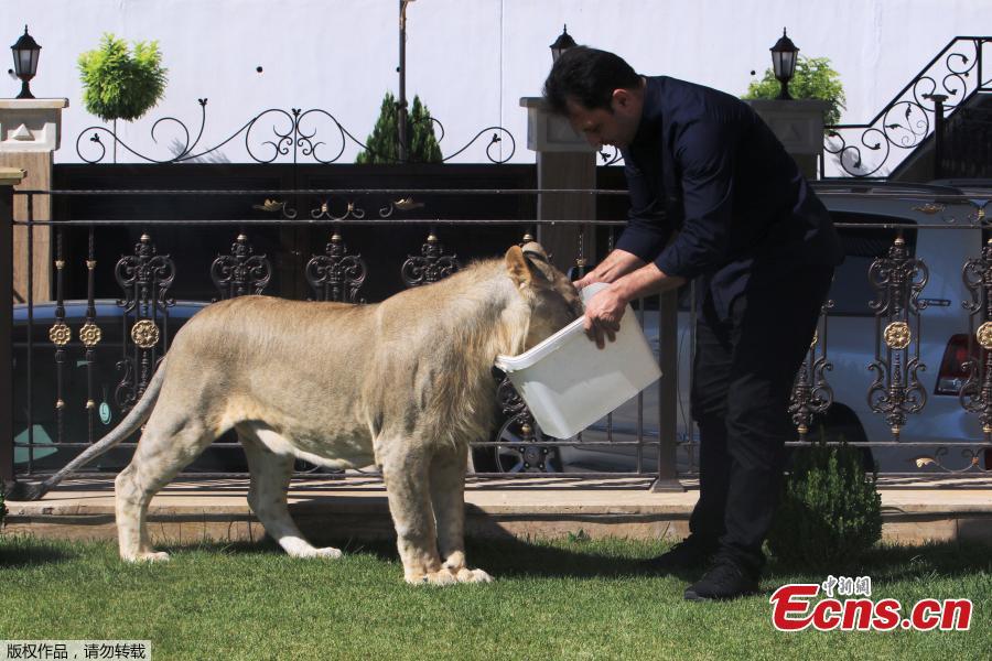 Kurdish Sheikh Blend Mamoon gives water to Leo, his 15-month old lion, at his house garden in Duhok, Iraq August 23, 2019. (Photo/Agencies)