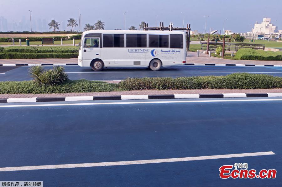 Photo taken on Sept. 3, 2019 shows the 200-metre stretch of blue road paved with the so-called 'cool pavement'. The 'cool pavement' is set with a protective material to reduce the damage from contact with vehicles and to extend its life. The 'cool pavement', reflecting about 50 percent of sunlight, consists of four layers of a primary material, followed by three layers of materials that reduce heat absorbed by solar radiation. (Photo/Agencies)