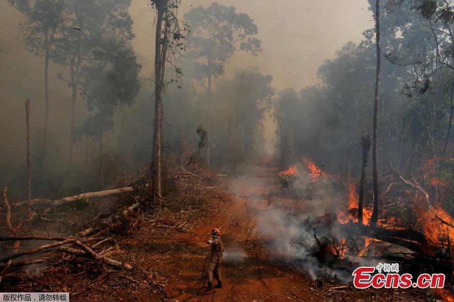 Photo shows a firefighter fighting the blaze in the Amazon rainforest, Sept. 4, 2019. (Photo/Agencies)
