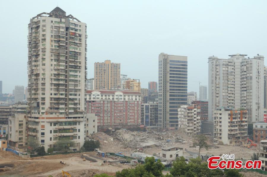 The Yida Building is demolished during a controlled explosion in downtown Yichang City, Hubei Province, Sept. 5, 2019. More than 400 kilograms of explosives and nearly 2,500 detonators were strategically placed within the 49.5 meter structure to bring it down quickly with minimum impact to its immediate surroundings. (Photo: China News Service/Zhou Xingliang)