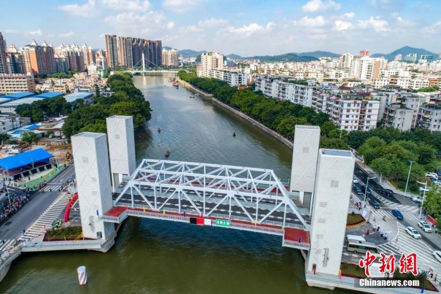 The Guangming bridge, first vertical-lift bridge, opens in Guangzhou, Guangdong Provice, Sept. 6, 2019. Measuring 116 meters long and 24 meters wide, the bridge has a four-lane expressway. (Photo/China News Service)