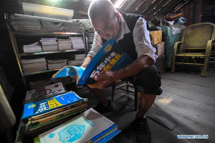 Tang Shangjun sorts teaching materials he bought at home in Wuhan Village of Anhua County in Yiyang City, central China's Hunan Province, Sept. 8, 2019. A wooden house stands alone in the deep mountains covered by a vibrant leafy blanket of trees, not only as a dwelling, but also as a classroom where Tang Shangjun has been tutoring students for more than 20 years. Tang, a 92-year-old rural teacher, started tutoring children left behind by their migrant parents free of charge in Wuhan Village in 1997, 10 years after he retired from teaching in Anhua County. As the village has limited access to teaching resources, Tang makes the trek to the county, even Beijing to buy teaching materials tailored for students. He also reads books and takes notes every day to increase his reserve of test questions. A smart phone, which Tang asked others to buy in the county, would help when he cannot answer test questions on his own. "As long as kids love studying, I will stay at my post even within an inch of life," said Tang. (Xinhua/Chen Zeguo)