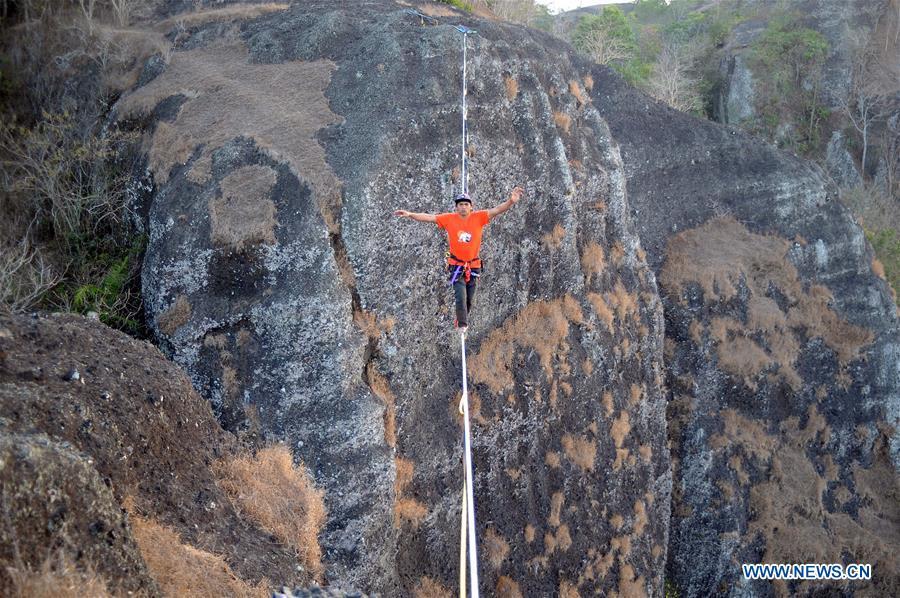 Extreme sport athlete Andi Ardi walks on a rope at the height of 740 meters on Mount Nglanggeran in Yogyakarta, Indonesia, Sept. 9, 2019. (Photo by Supriyanto/Xinhua)