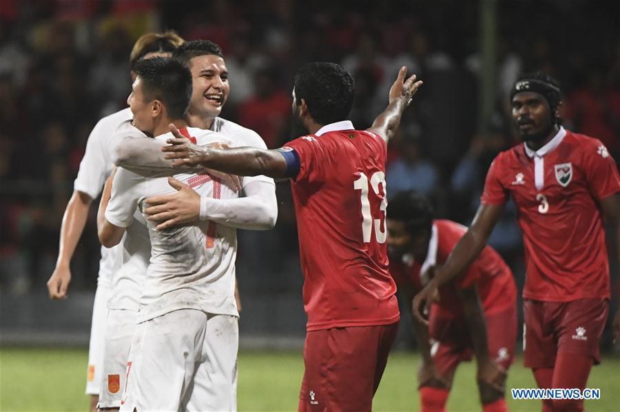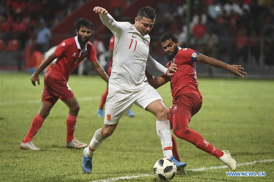 Wu Lei (front C) of China competes during the match between China and Maldives at the 2022 FIFA World Cup Asian second round qualification tournament in Male, capital of Maldives, Sept. 10, 2019. (Xinhua/Wang Shen)