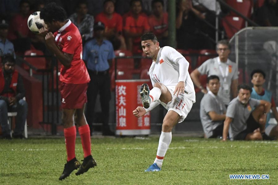 Ai Kesen (R) of China competes during the match between China and Maldives at the 2022 FIFA World Cup Asian second round qualification tournament in Male, capital of Maldives, Sept. 10, 2019. (Xinhua/Wang Shen)