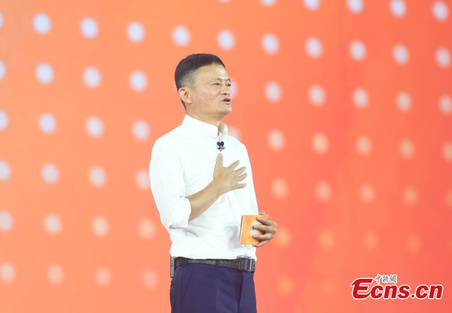 Alibaba founder Jack Ma speaks on the stage during Alibaba's 20th anniversary gala in Hangzhou City, Zhejiang Province, Sept. 10, 2019. Jack Ma officially stepped down as group chairman of Alibaba Tuesday, handing over the position to the company CEO Daniel Zhang. (Photo: China News Service/Wang Gang)