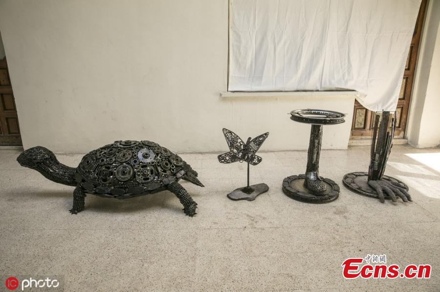 Mosaic master Mervan Altinorak and his daughter work on figures of animals like turtle, butterfly and eagle, made of tool scraps including chain, nail, bow, marble, damper, screw, balata, spark plug and auto fork in Hatay, Turkey on September 10, 2019. Altinorak family gather the pieces of scraps contribute to their budget and recycle. (Photo/IC)