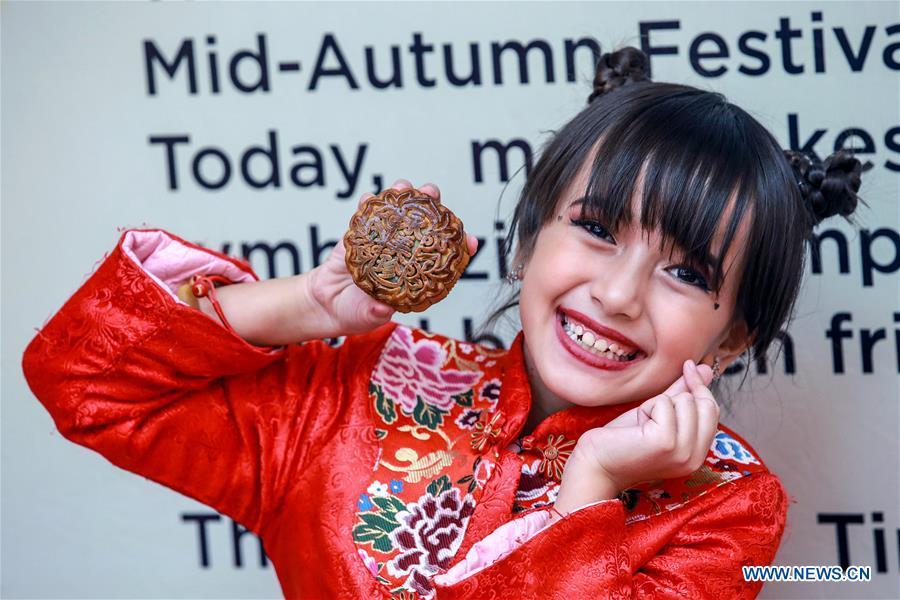 A girl poses with a mooncake at a mall in Chinatown in Manila, the Philippines, Sept. 11, 2019. The Chinese Mid-Autumn Festival falls on Sept. 13 this year. (Xinhua/Rouelle Umali)