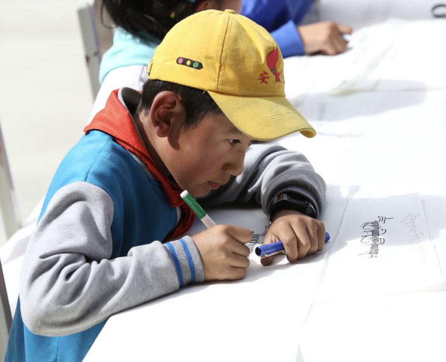 Students practice calligraphy at the Mid-Autumn Festival gathering in the Tsome village of Tibet's Doilungdechen district on Wednesday. (Photo/chinadaily.com.cn)