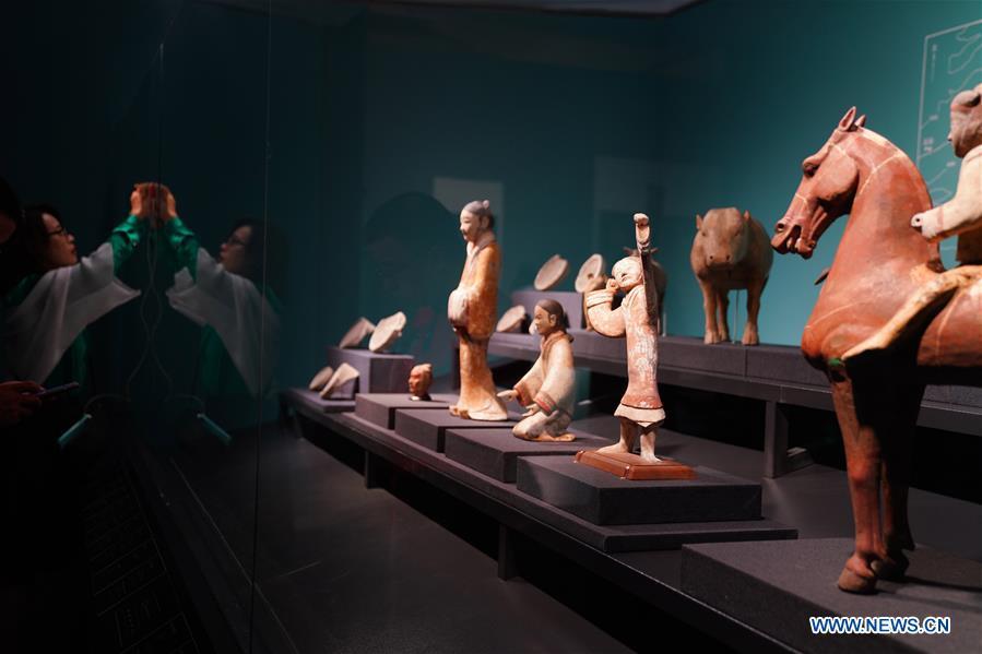 Photo taken on Sept. 10, 2019 shows exhibits of the exhibition about the cultures and arts of the ancient Zhou, Qin, Han and Tang dynasties in Tsinghua University Art Museum in Beijing, capital of China. More than 300 exhibits are on display during the exhibition themed "Everlasting Like the Heavens" from Sept. 10 to Dec. 17. (Xinhua/Wu Jianlu)