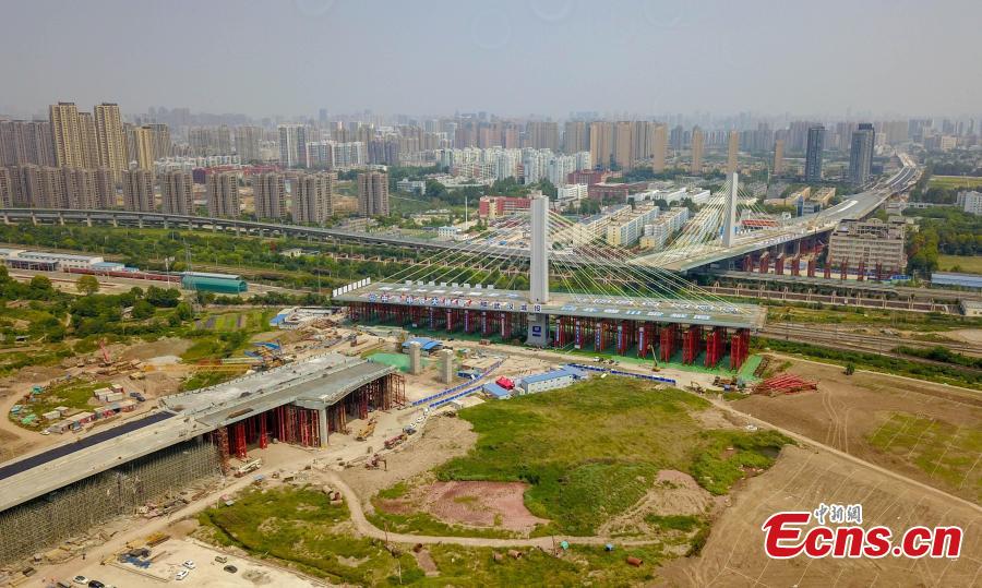 A 248-meter-long, 18,000-ton bridge section is rotated into position during the construction of a bridge over railway lines in Wuhan, Hubei Province, Sept. 11, 2019. The day previous, another section of the same length and weight was also rotated into position. The two sections were not connected to form a 508-meter-long, cable-stayed bridge, which is 44 to 46 meters wide, the longest and widest of bridges built using the method of swivel construction. This bridge is an auxiliary project of the massive Yangsigang Bridge across the Yangtze River, a double-deck suspension bridge with the longest span in the world. (Photo: China News Service/Zhang Ziyan)