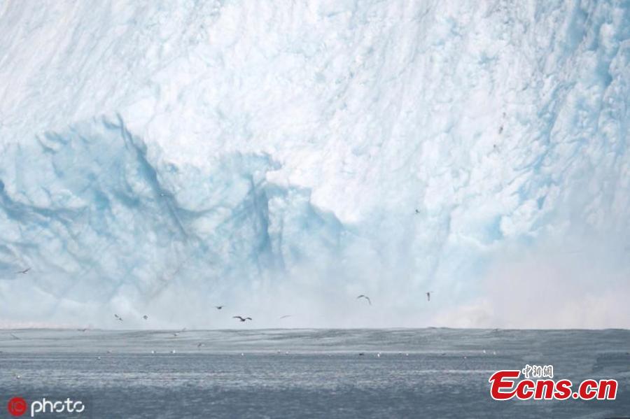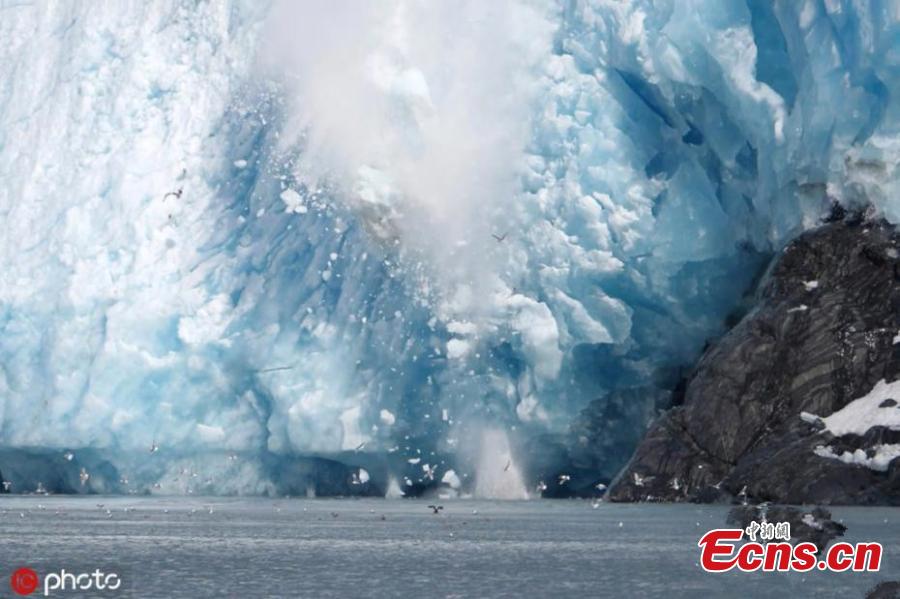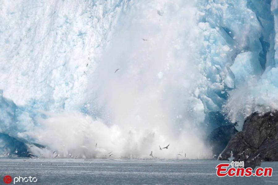 Huge pieces of ice fell from an active glacier in Alaska and crashed into the sea, sending birds fleeing and a creating a huge wave. Chenega Glacier shed the massive shards into the sea last month as tourists went on a tour around at Prince William Sound, Alaska. Small pieces began to fall which escalated into larger and larger pieces falling off the glacier. (Photo/IC)