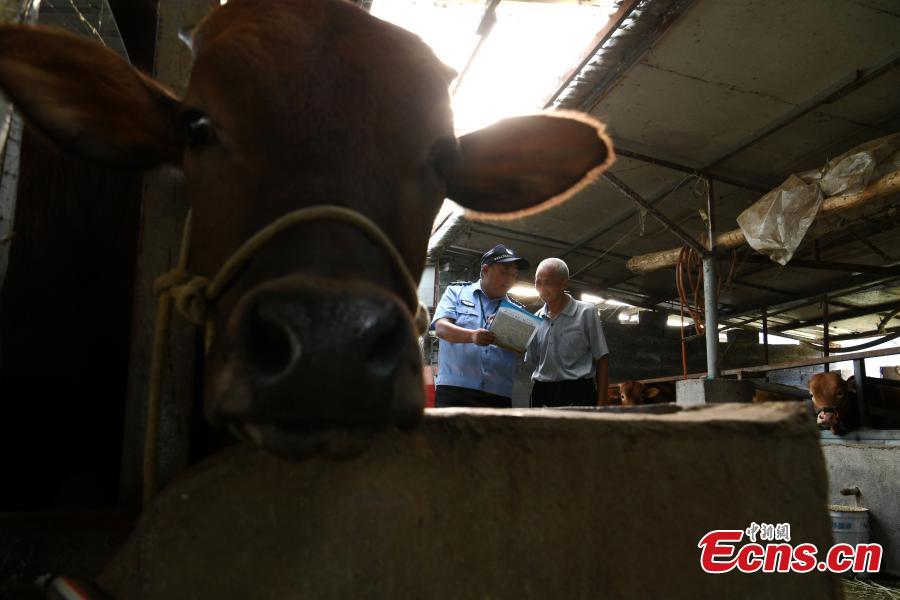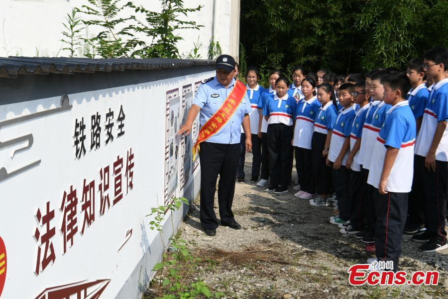 Police officer Huang Hongping, 57, spreads his message of railway safety in the homes of farmers and for students in Xuancheng City, East China’s Anhui Province, Sept. 10, 2019. As the railway line passes through villages and schools, Huang and his team have made great efforts to improve people’s awareness of railway safety over three decades. (Photo: China News Service/Han Suyuan)