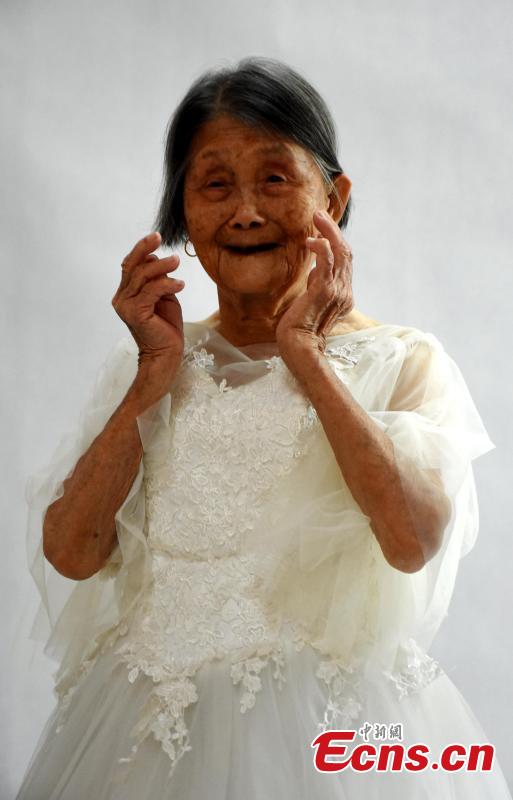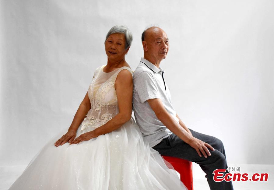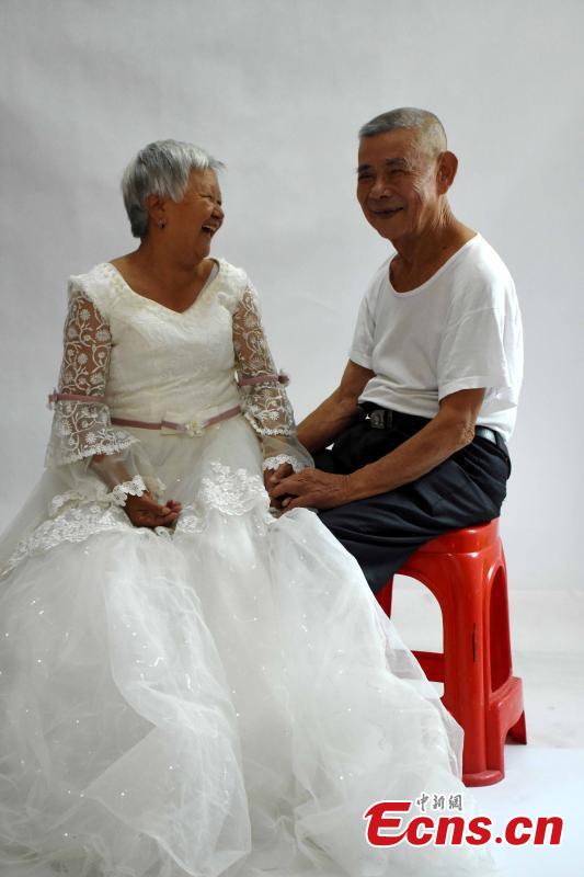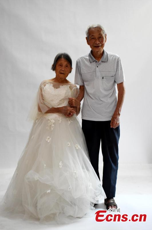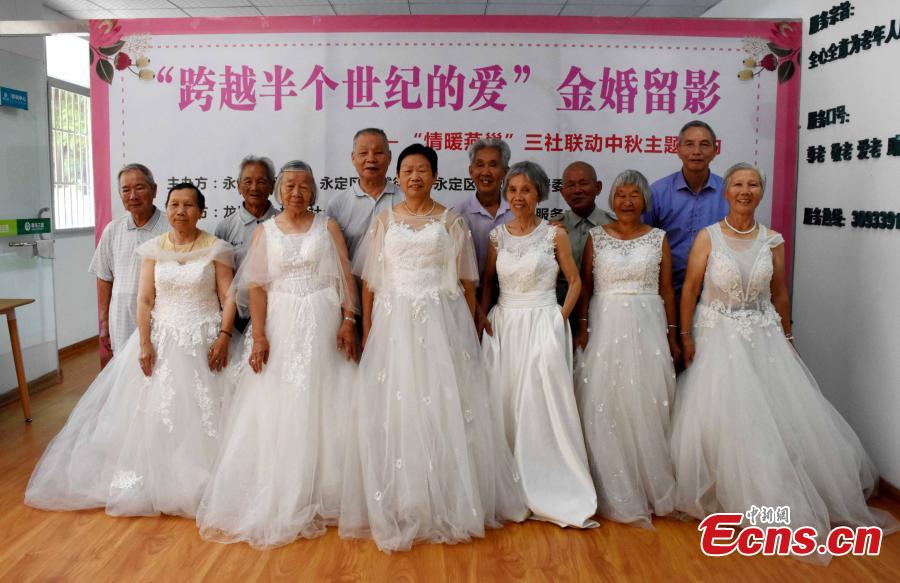 Eleven pairs of couples, who have got married for over 50 years and are also receiving subsistence allowance from the government, pose for a photo to celebrate their golden weddings at an elderly care center in Longyan City, East China's Fujian Province, Sept. 11, 2019. This was the first time for most of the couples to take photos in a wedding dress, an activity organized by local authorities to celebrate the Mid-Autumn Festival on Sept. 13. (Photo: China News Service/Su Gaolong)